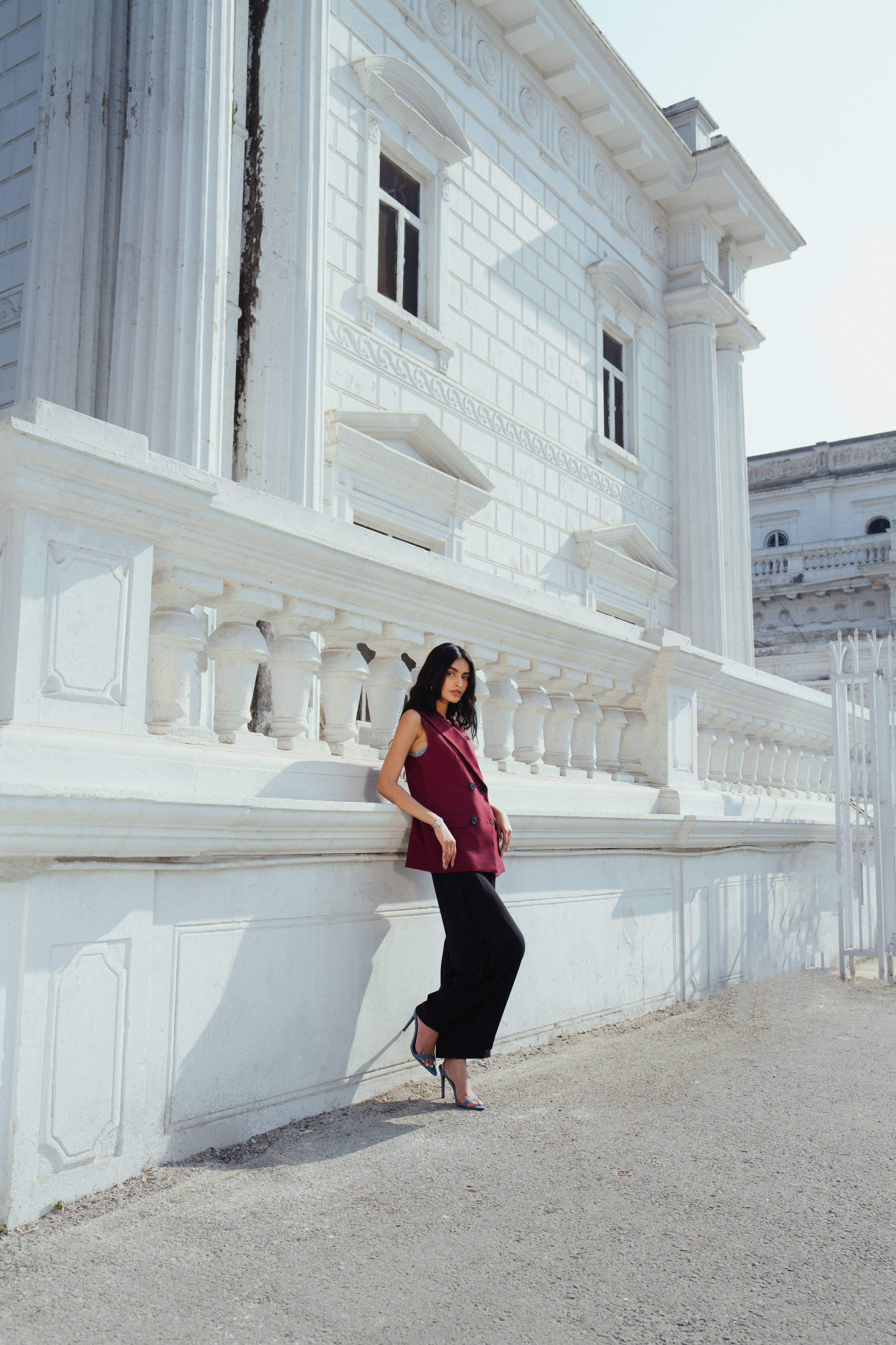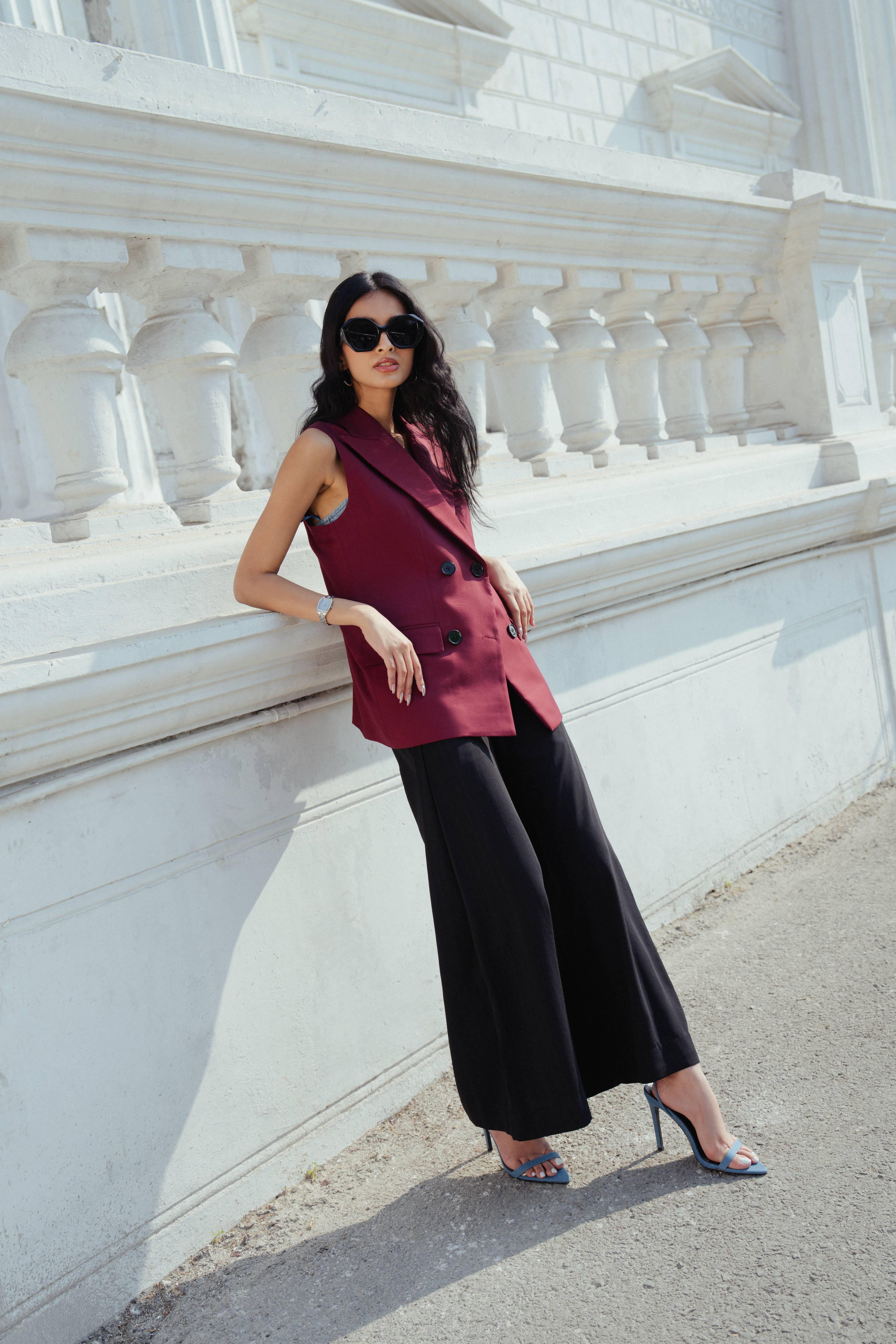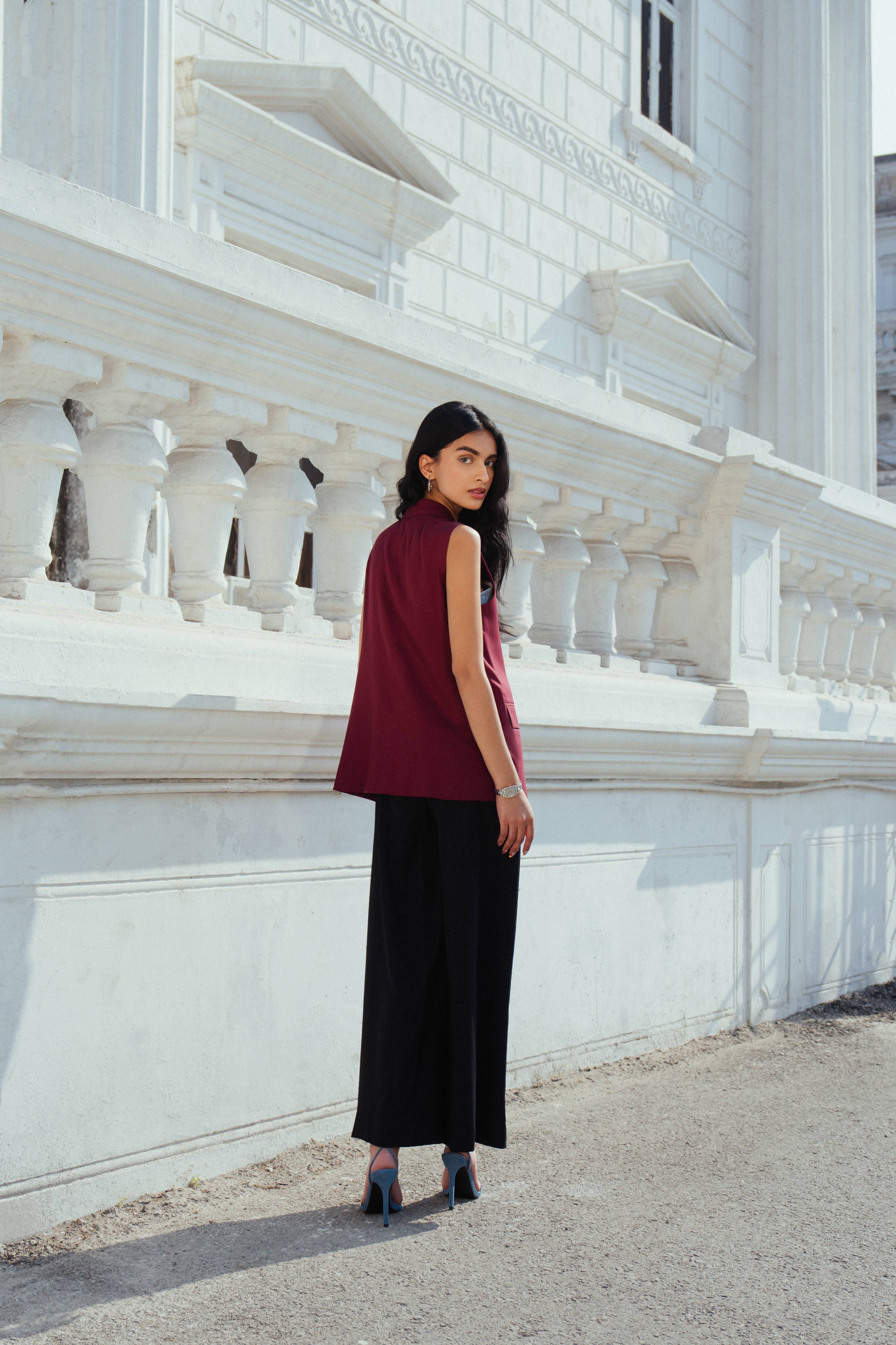 Paired with self printed high-waisted palazzo trousers