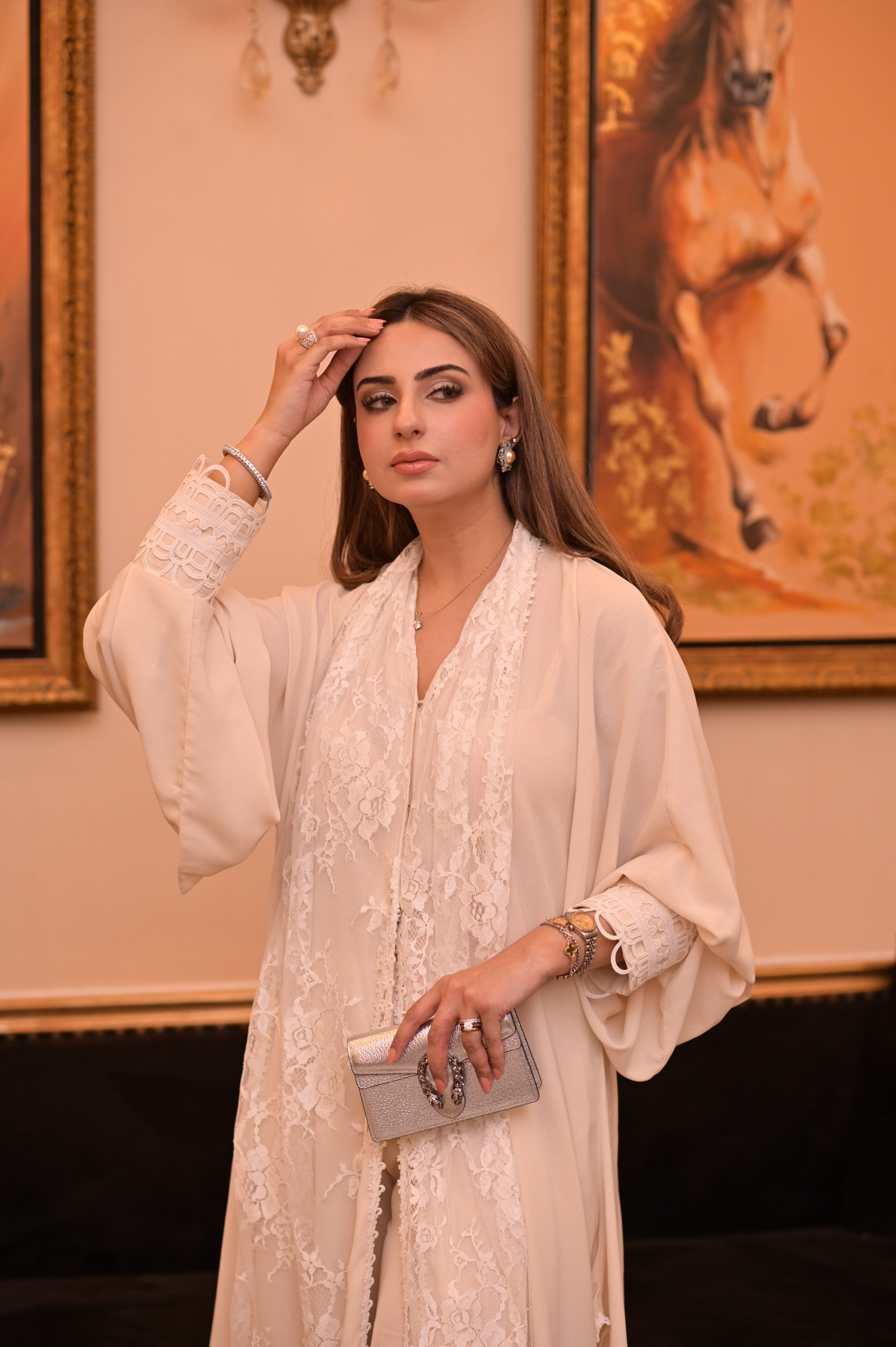 - Timeless long cape-style ensemble featuring an open-front silhouette.