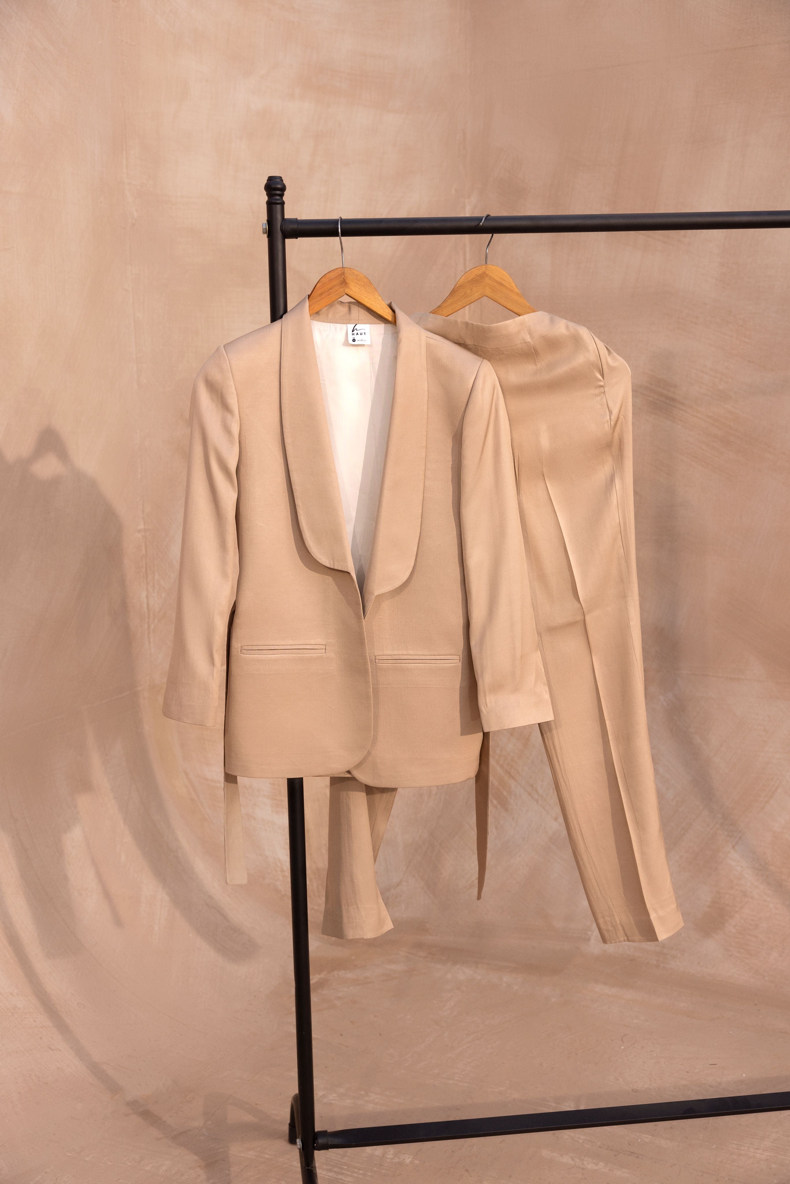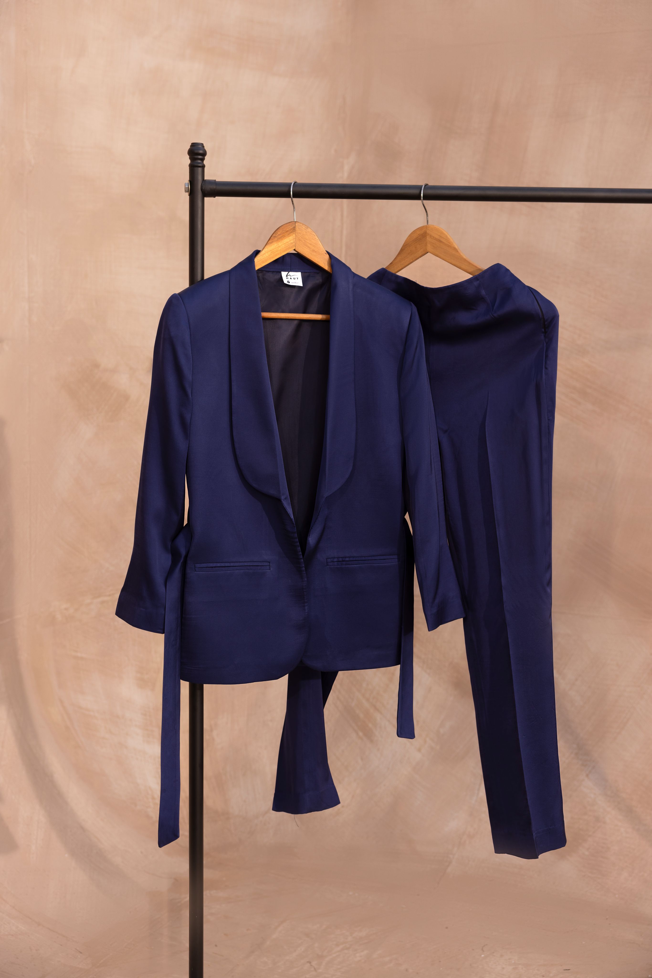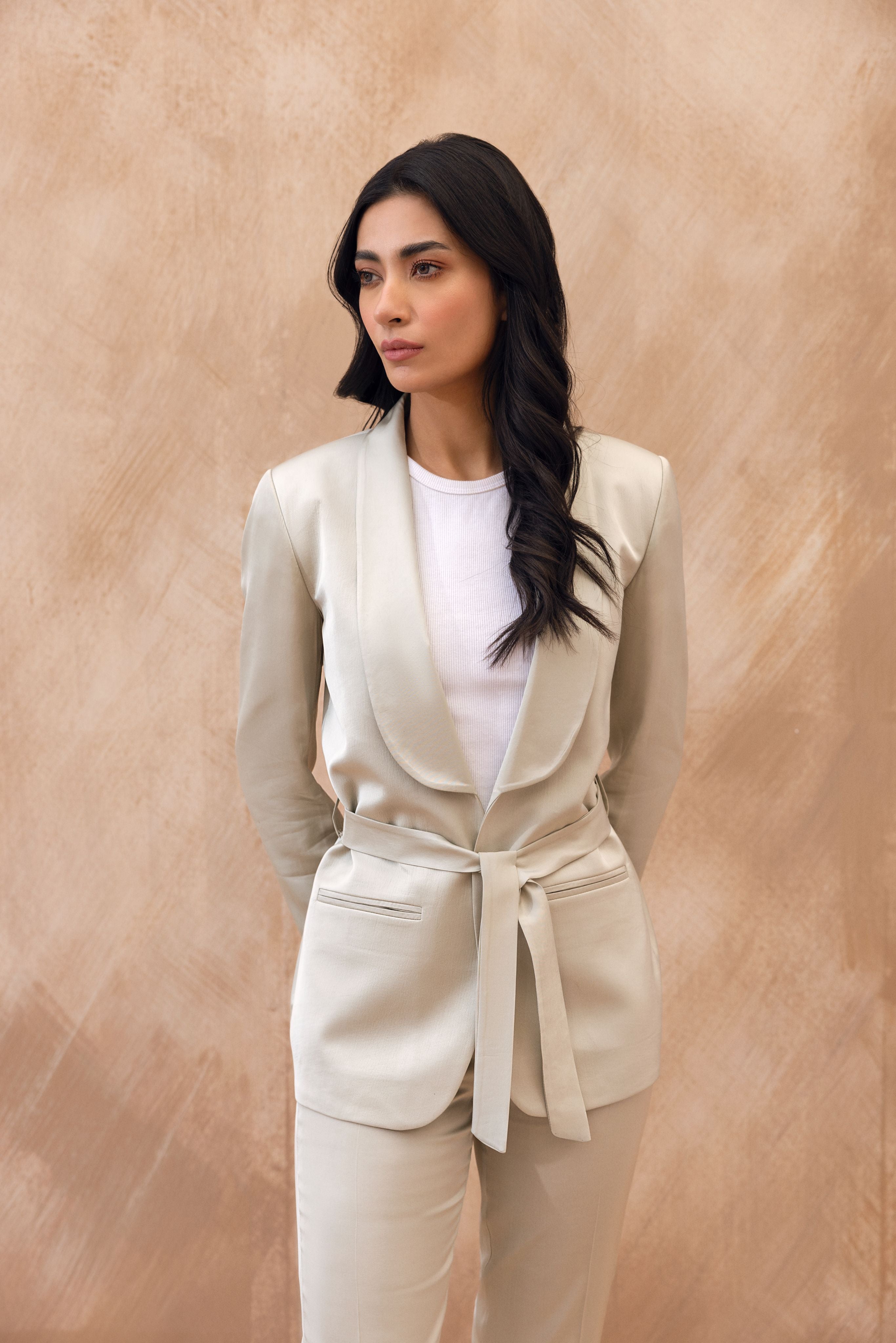 - Full sleeved belted blazer with shawl collar.