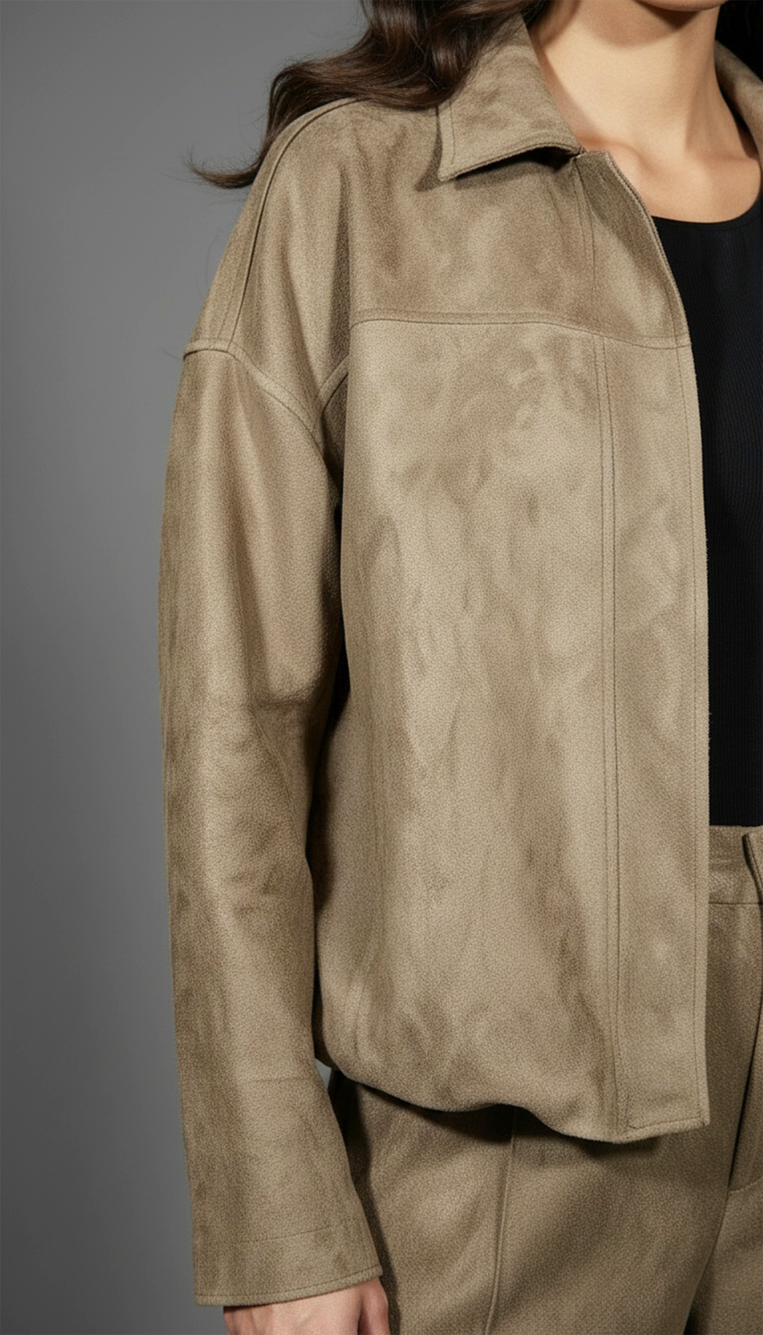 A bomber-style cut with a relaxed, slightly oversized fit jacket.