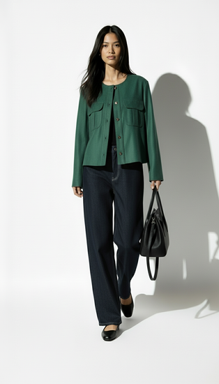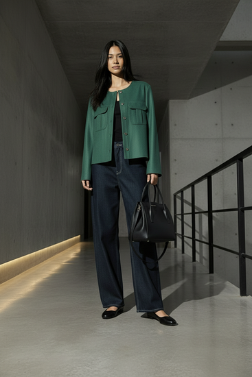 Structured front pocket jacket, round neckline, with front button closure