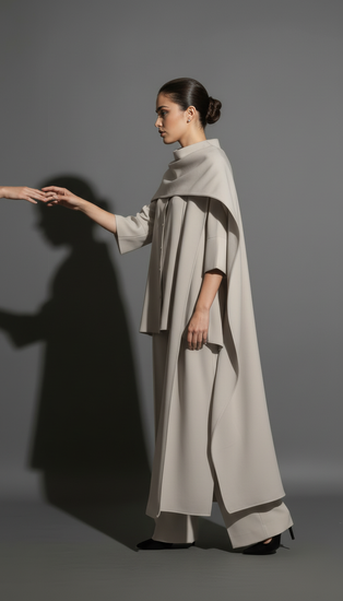 Split-Side Detailing: Designed with slits or openings along the sides, allowing the arms to emerge while maintaining the full, continuous flow of the fabric.